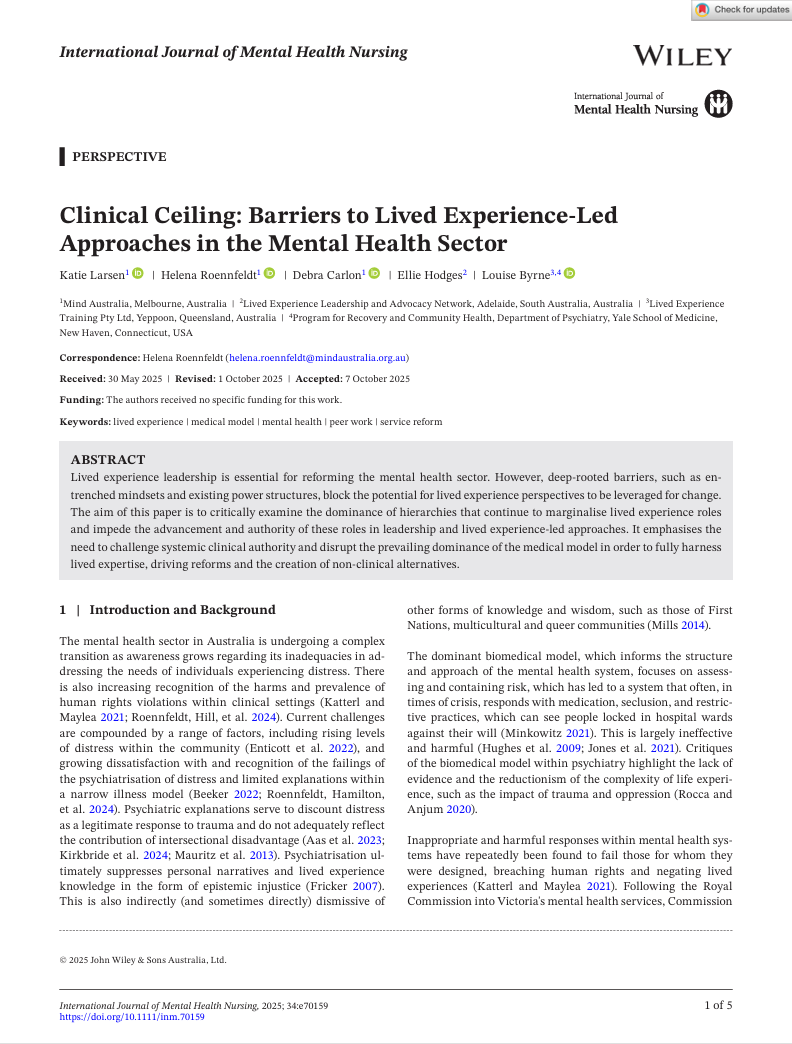 Dit wetenschappelijke artikel laat zien dat ervaringskennis in leiderschap belangrijk is voor vernieuwing in de ggz en de ontwikkeling van niet-klinische alternatieven. Het artikel bekritiseert de beperkingen voor de positie van ervaringsdeskundigen uit, zoals de dominante klinische autoriteit, vastgeroeste denkbeelden en machtsstructuren.