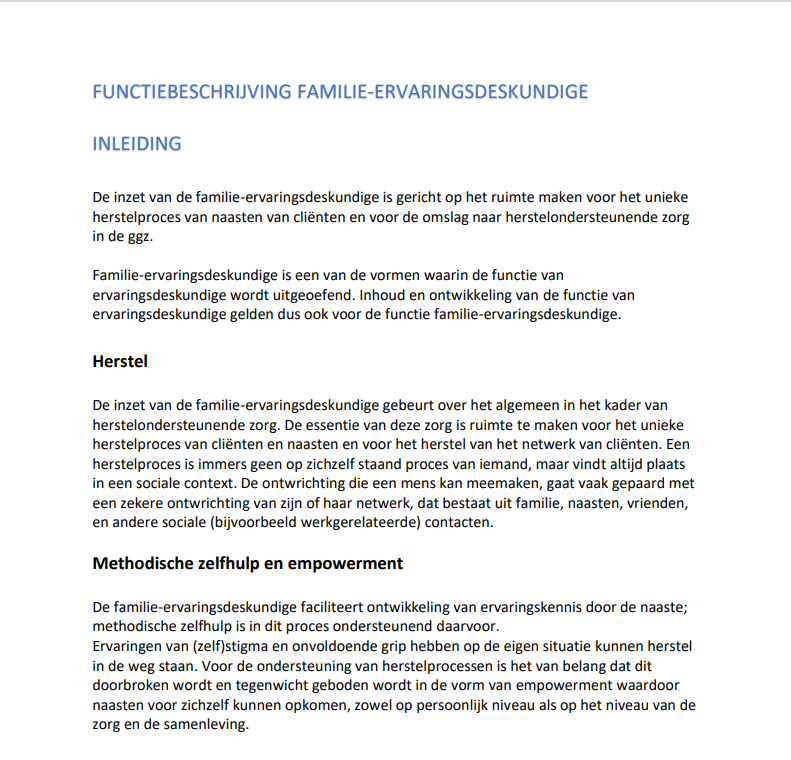 Deze handreiking geeft een functiebeschrijving met rollen en taken van familie-ervaringsdeskundigen binnen de geestelijke gezondheids- en verslavingszorg