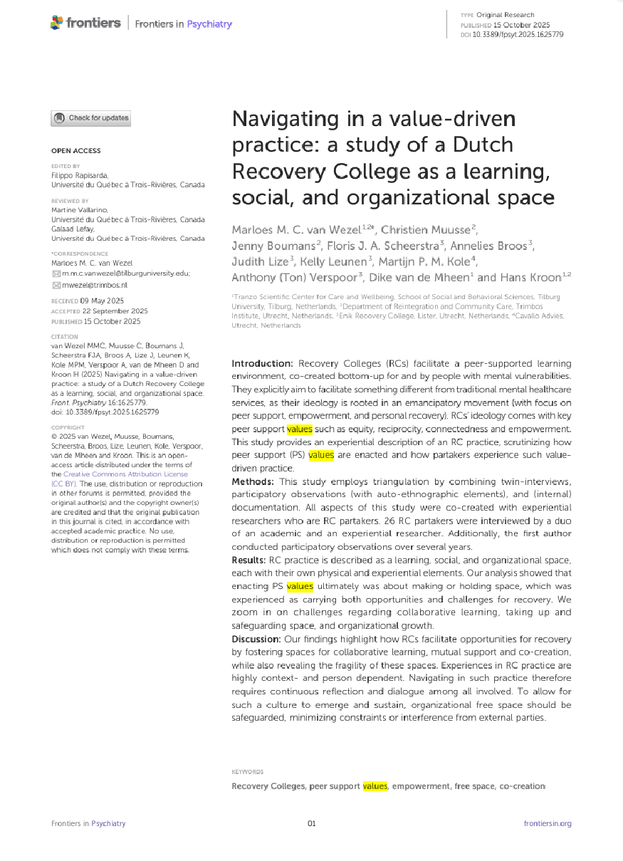 Dit wetenschappelijke artikel beschrijft de resultaten van een onderzoek naar Herstelacademies. In het onderzoek is er gekeken naar hoe de waarden onder peer-support worden toepast en hoe deelnemers dit ervaren. Herstelacademies zijn bedoeld voor mensen met psychische problematiek.